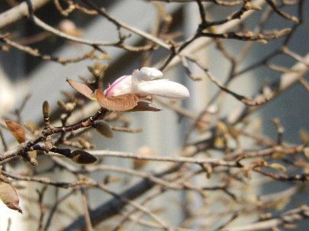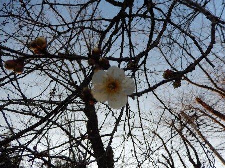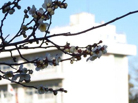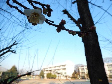 その寒波のせいか、武里小学校の梅のつぼみは固かったのですが、今朝今季初の梅の花が一輪開きました。