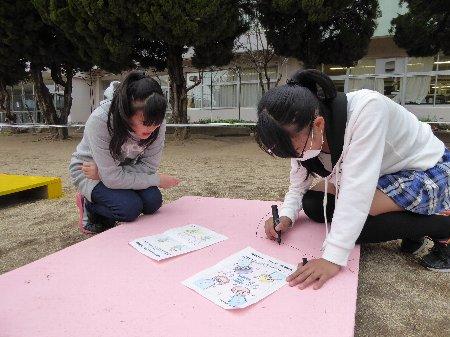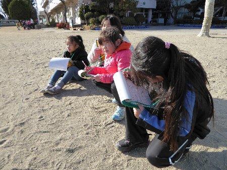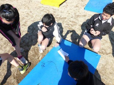 3年生が、ほかのグループにわからないように丸くなって何かやっています。