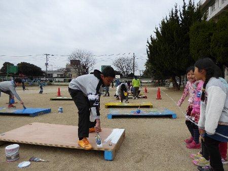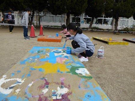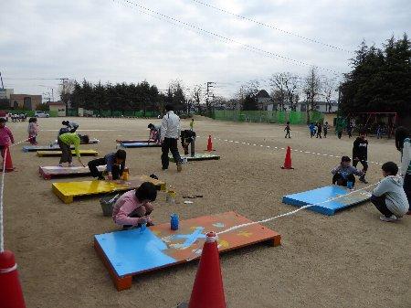 卒業を前に、6年生が取り組んでいるなわとび練習台のリニューアルは、いよいよ最終段階のペイントです。
