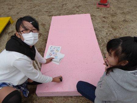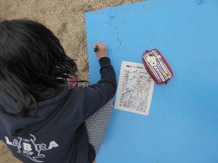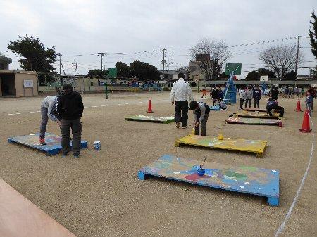 下塗り、下絵と作業が進むごとにみんなが見ていたなわとび練習台のリニューアル。