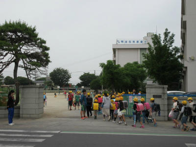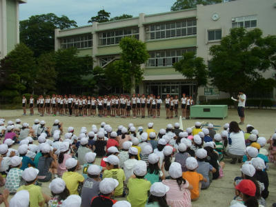 校庭で出発式を行った後、会場校である正善小に向かいました。