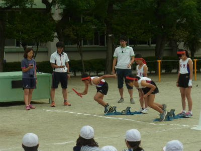選手紹介の後、5・6年生のリレーチームが、全校児童の前で走りを披露しました。