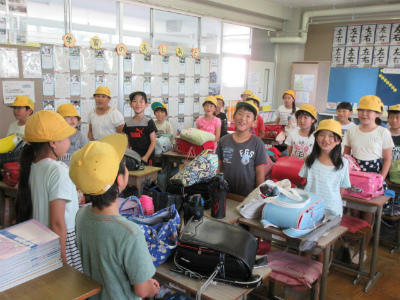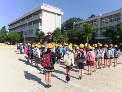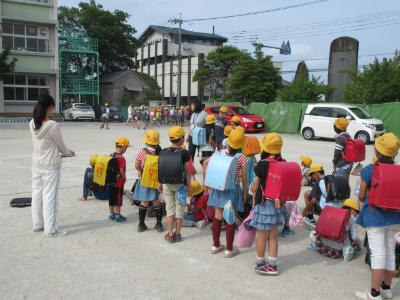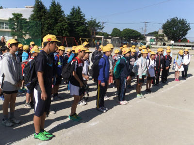 まず地区ごとに教室に集まった後、校庭に集合して下校しました。