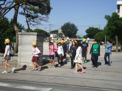 交通指導員さんや保護者・地域の皆様に見守られて横断歩道を渡ります。