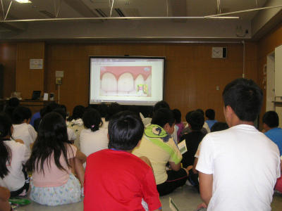 クイズに答えたり、実際に歯ブラシを歯に当ててみたりしながら、正しい歯みがきのしかたについて学びました。