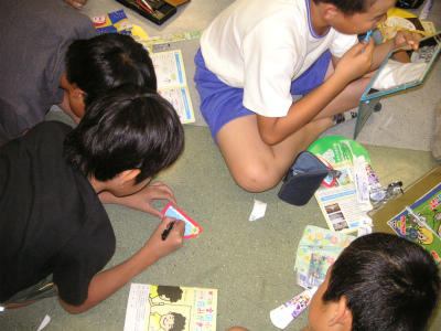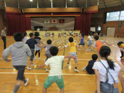 教室で学習した後は、校庭で遊ぶことになっています。今日は残念ながら雨天のため、体育館でカードゲームをしました。