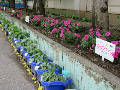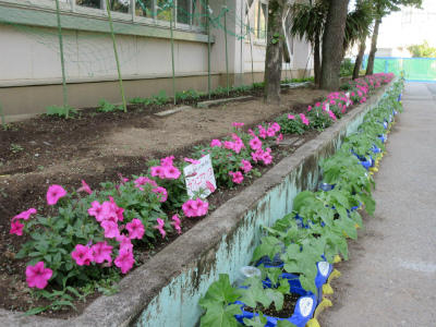 2週間ほど前にサントリーフラワーズから「サフィニア・マックス」の花苗を100株いただき、5年生と6年生が中心になって植え込みをしました。そのときにはまだまだ小さかった苗が順調に育ち、鮮やかな色の花を咲かせ始めています。