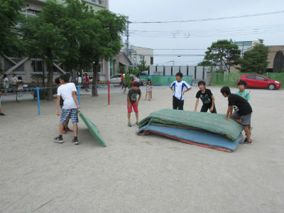 運動委員会の児童がマット出しをしてくれています。武里小学校の子どもたちが安全に鉄棒運動ができるように、毎日がんばっています。