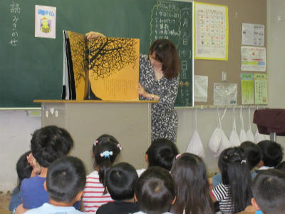 4年生への読み聞かせです。 どの子の表情も真剣ですね。