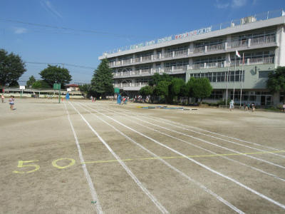 校庭には、運動会のリレー選手を決めるためのラインがひかれています。
