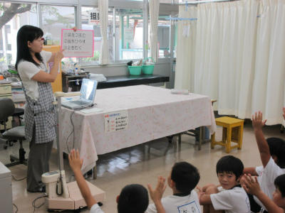 測定の前に、鼻血が出たときの対処法などについて、クイズ形式で学びました。