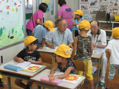 15年間に渡り、武里小近くの交差点で安全指導をしてくださった交通指導員さんが、この度御退職となります。 そこで、今日のわんぱくタイムの後に、感謝の気持ちを伝えました。
