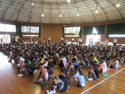 校庭にはまだ水がたまっているので、朝の運動会全校練習は、体育館で行うことになりました。