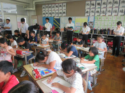 今日は、ふれあい体験の大学生も授業に参加しています。