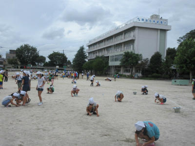給食後、運動会に向けて全校児童で校庭の石拾いをしました。