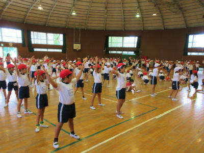 校庭にはまだ水がたまっているので、朝の運動会全校練習は、体育館で行うことになりました。