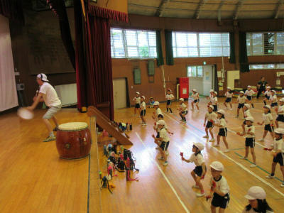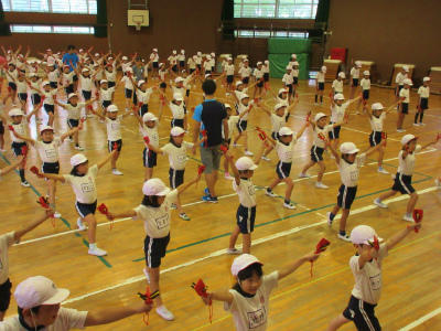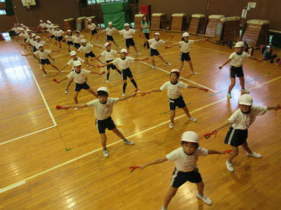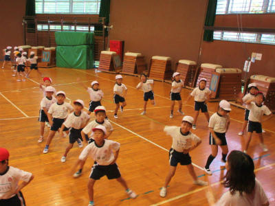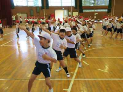 低学年のダンスです。まだ練習を始めて間もないのですが、早くも基本的な動きをマスターしてしまいました。体全体を使った、リズム感のあるダンスに仕上がりそうです。