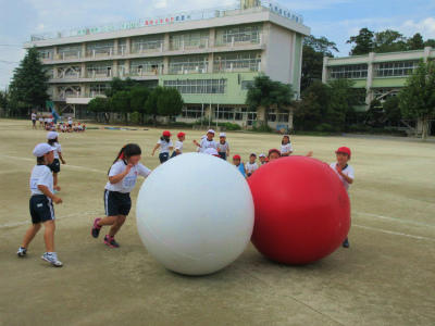 運動会の全校種目、大玉送りの練習をしました。
