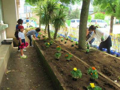 PTA厚生部の皆様が、花壇に花の苗を植えてくださいました。