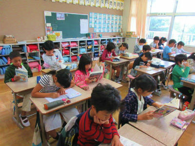 先週の全校一斉読み聞かせに引き続き、今日は2年生の教室で「読み聞かせ」が行われました。他のクラスでは、それぞれが選んだ本を読んでいます。
