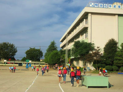 武里小では、校門を入った児童が昇降口に向かうときに、校庭の中を通過していきます。