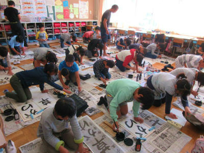 いよいよ書き初め練習が始まりました。5年生の今年のお題は「七草がゆ」です。