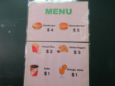 リアルなハンバーガーやポテトを用いながら、会話のしかたを学びます。