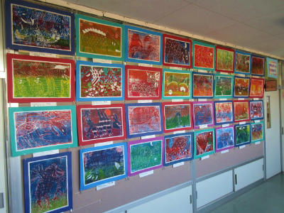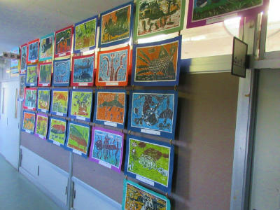 廊下側の壁面に、版画の作品を展示しています。本日の授業参観のときに、ゆっくりと御覧ください。