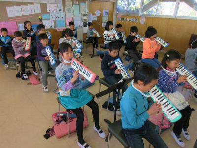 鍵盤ハーモニカで「パフ」の演奏をしています。