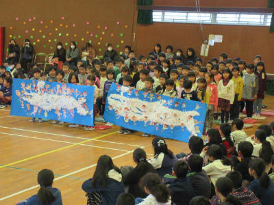 絵画や習字、書き初め、押し絵羽子板など、様々な子どもたちの作品を、年間を通して何度も掲示していただく機会があり、日頃から交流・連携を頻繁に実施してきている、特別養護老人ホーム「フラワーヒル」さんを、今日は3年生全員で訪問し、お年寄りとの交流をしてきました。
