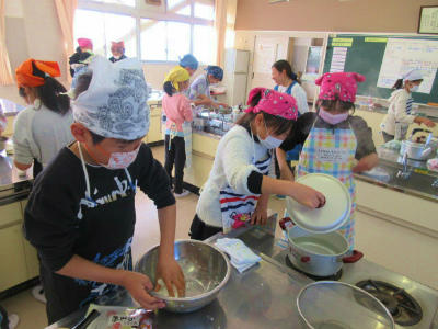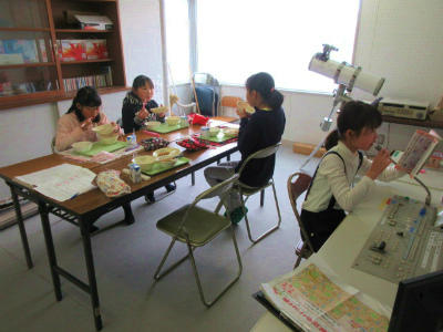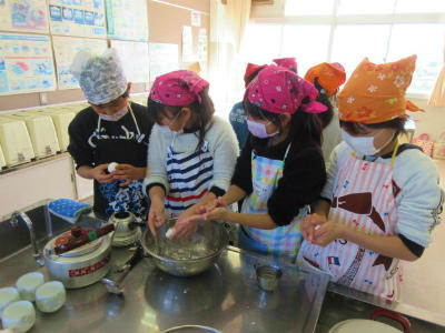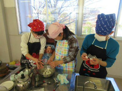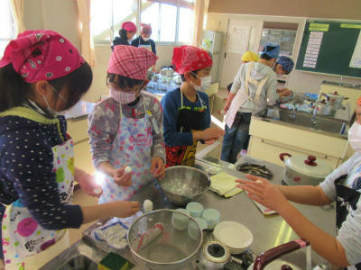 白玉だんごづくりです。ちょうどよい大きさのだんごができたようですね。
