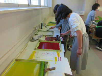 お面作りをしています。水にぬらしたお花紙を重ねていくと、不思議な色合いを表現することができます。