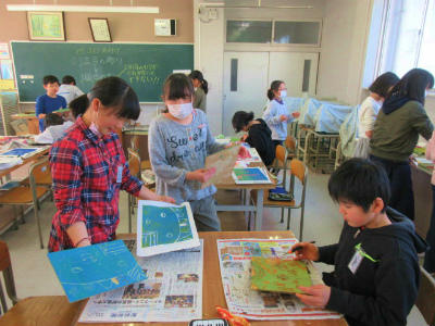 わかたけの時間(総合的な学習の時間)で、調べたことを模造紙にまとめているところです。