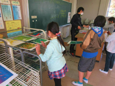 3年生が持っている大きな袋は「作品バッグ」と呼ばれ、この1年間に描いた作品が入っています。一生の宝物ですね。