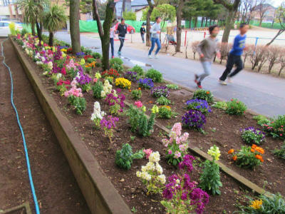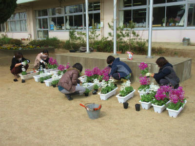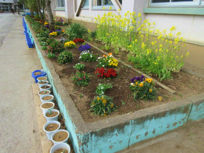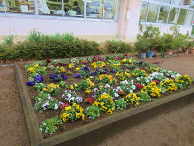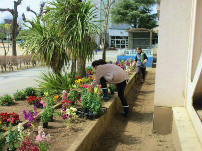 PTA厚生部の皆さんが、花壇やプランターに花の苗を植えてくださいました。