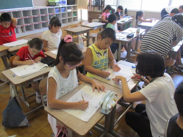 今日からサマースクールが始まりました。真っ黒に日焼けした子供たちが、計算問題に集中して取り組みました。金管バンドやバトンクラブの練習も再開しました。