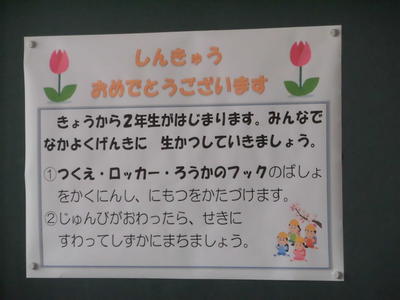 みなさん、げんきにすごしていますか。2年生としてのせいかつがスタートしました。はじめてのクラスがえはきんちょうしたこととおもいます。
