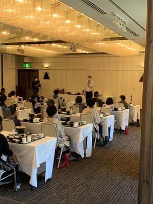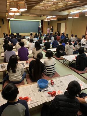 美味しい夕食も終わり、赤べこの絵付け体験を行っています。講師の先生より、赤べこの由来について説明を受け、いよいよ作成です。