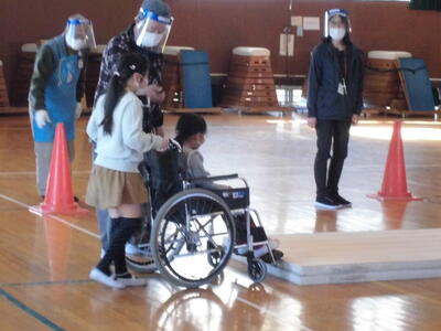 二人組になって、実際に車いすに乗ってみたり押してみたりしながら、
