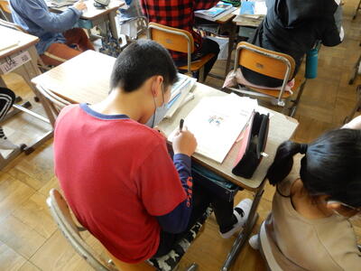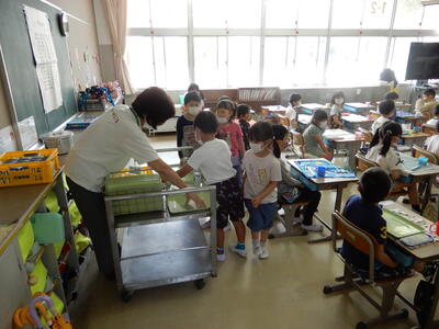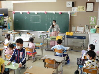 朝の時間、6年生のみなさんが、1年生のみなさんに、学校での身の回りのことを教えてくれています。