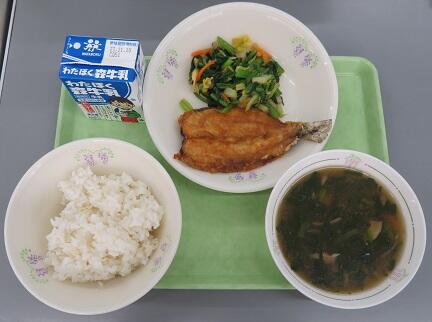 本日の給食は、麦ごはん、牛乳、いわしのかば焼き、みそあえ、みぞれ汁でした。