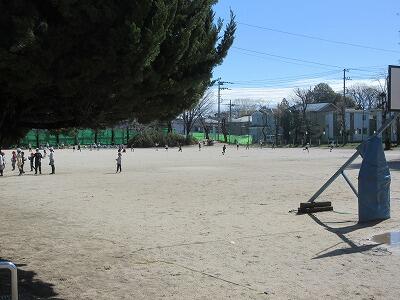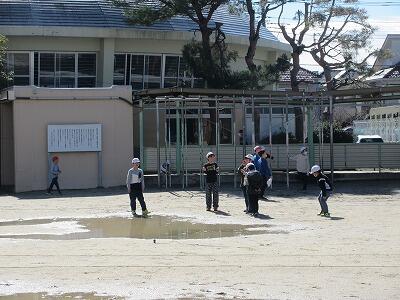 朝方までの雨による水たまりが校庭にはできています。子供達はお構いなしに、元気に過ごしてます。