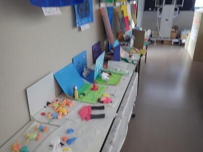 4年生教室前の廊下には、作成した図工の作品が並べられています。