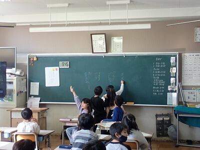 4年2組は算数。分数の大きさを比べます。自分の考えを友達に伝えながら確認します。