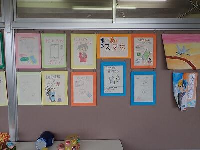 1組の廊下掲示、SNSやスマホの正しい使い方についてのポスターが貼られています。