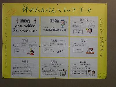 保健室前の掲示物には、健康診断などの日程が掲示されています。自分の「体たんけん」大切です。