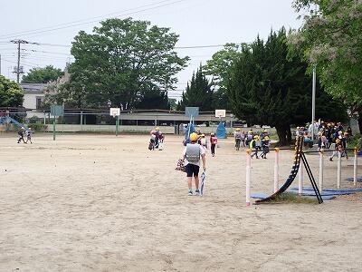 1の3体育。赤帽子の1年生は、元気に遊具遊びなどに取り組んでいます。