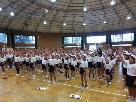 本当は外で実施を予定していたのですが、この雨のため、急遽体育館で運動会で歌う歌の練習となりました。