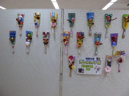 武里地区公民館2階のホールに先日3年2組が制作した押し絵羽子板が展示されています。