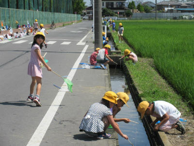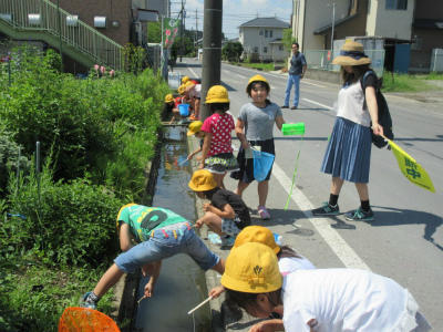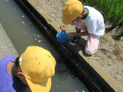 中野中近くの用水路でザリガニ釣りをしました。保護者のボランティアの皆さんにも見守っていただき、たくさんのザリガニを捕まえることができました。